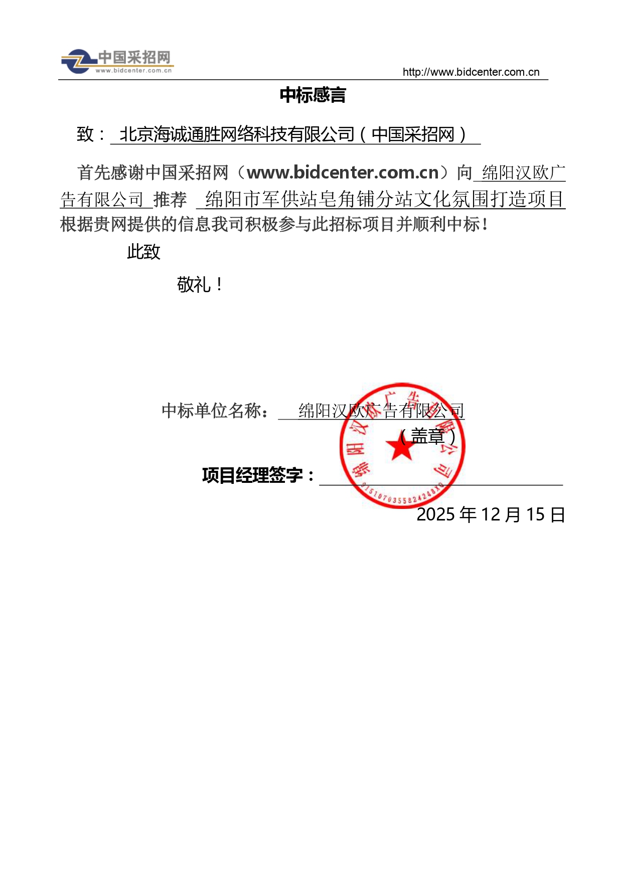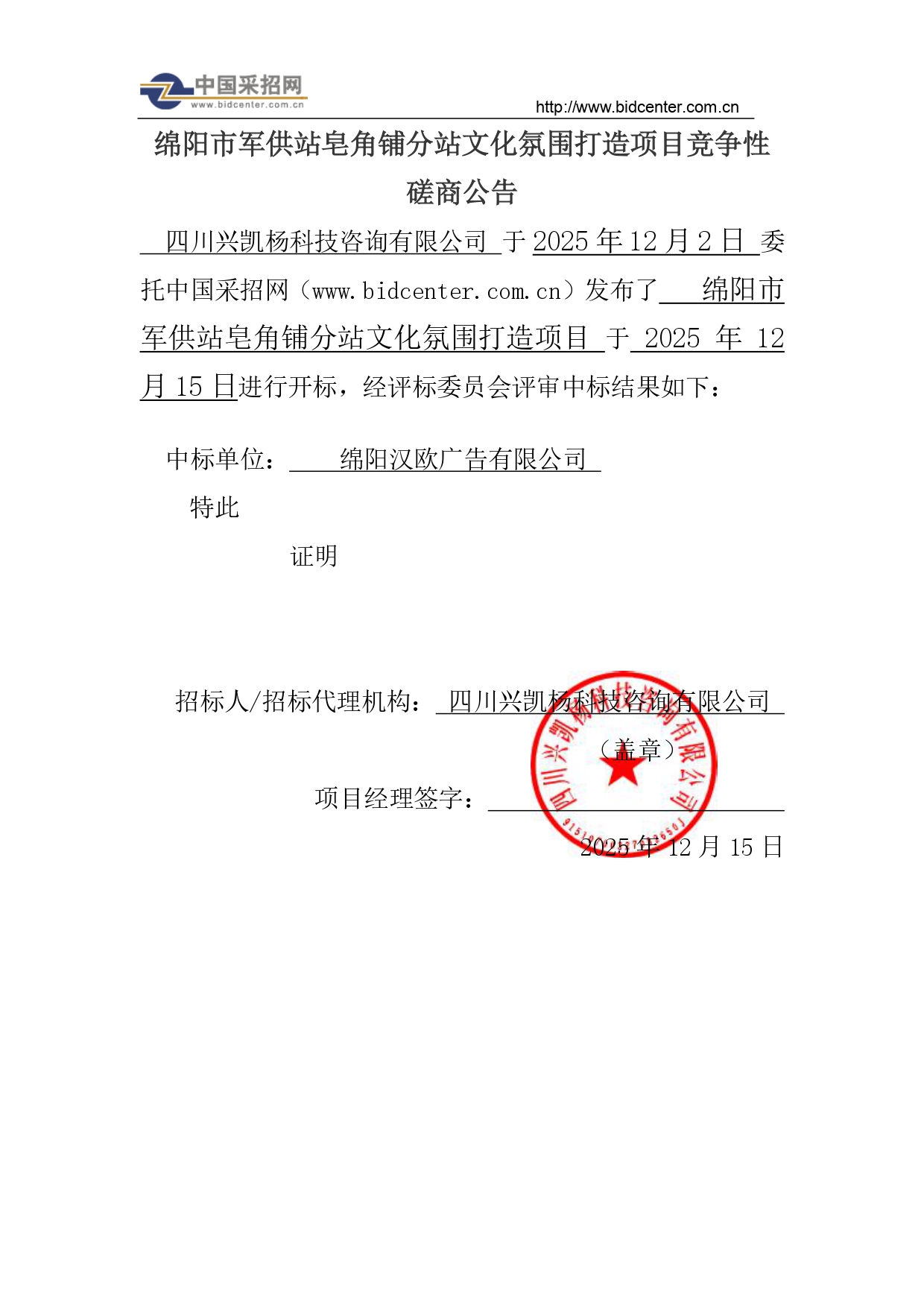 中標(biāo)項目: “綿陽市軍供站皂角鋪分站文化氛圍打造項目”成交公告